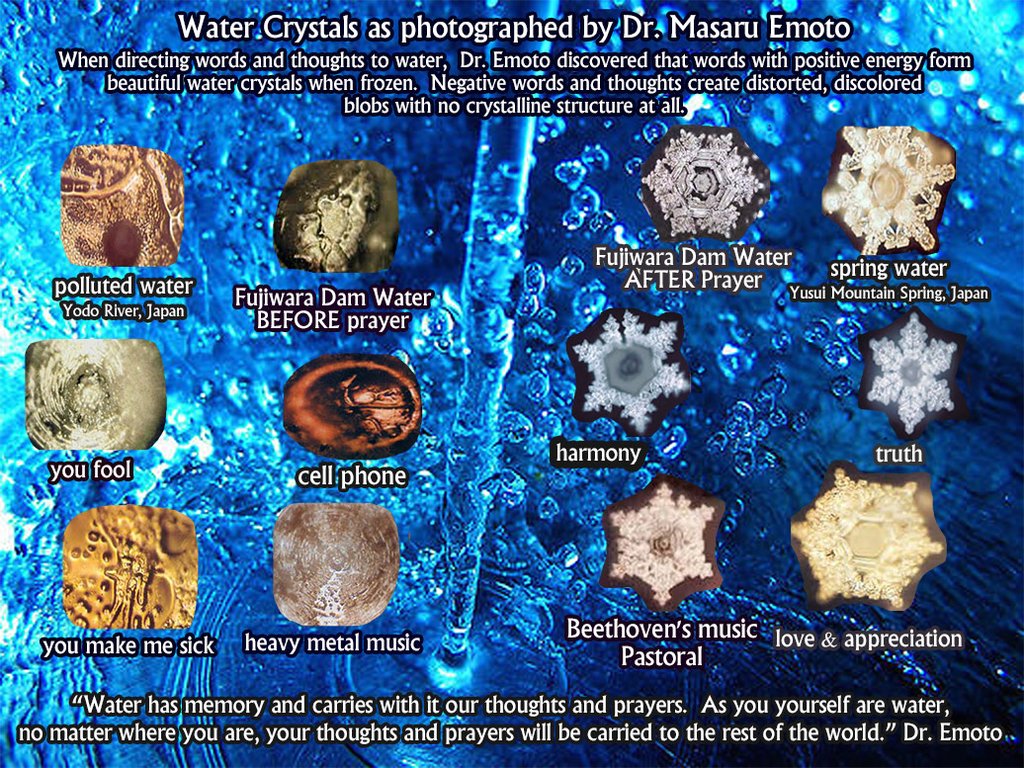Antara tahun 1994 hingga 2004, Dr. Emoto melakukan serangkaian eksperimen yang menunjukkan bahwa air dapat bereaksi terhadap kata-kata. Dalam penelitiannya, ia menemukan bahwa kata-kata positif seperti cinta, syukur, dan kebaikan membentuk kristal air yang indah dan harmonis. Sebaliknya, kata-kata negatif menghasilkan pola kristal yang kacau dan terdistorsi.